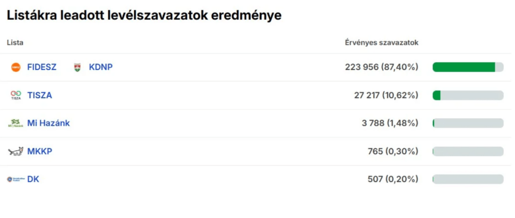 Az eddigi levélszavazati adatok alapján a Fidesz 87,40%-ot, míg a Tisza Párt 10,62%-ot kapott