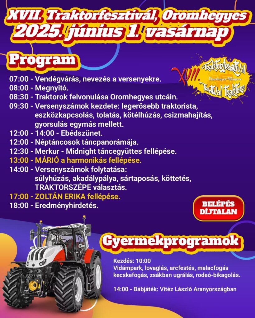 Június elsején, vasárnap rendezik meg Oromhegyesen a 17. traktorfesztivált. A teljes program az alábbi fotón tekinthető meg: