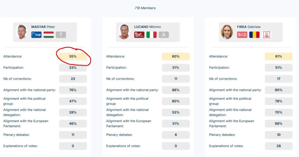 A portal.assisteu.eu adatai szerint Magyar Péter az üléseknek mindössze 55 százalékán vett részt, parlamenti aktivitása 33 százalékos, és eddig 11 alkalommal szólalt fel. Egyetlen szavazatához sem fűzött indoklást, vagyis nulla darab „magyarázatot” adott, ami példátlanul alacsony teljesítmény.